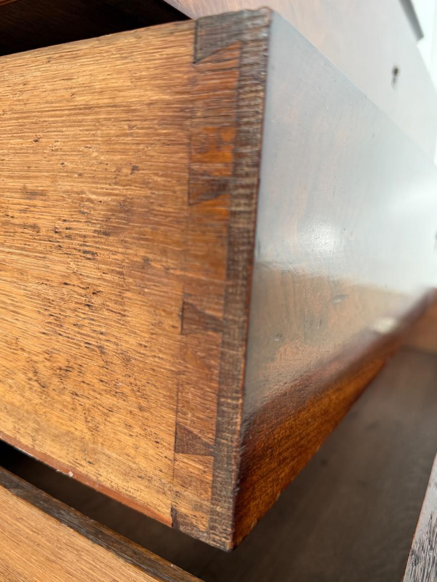 Fineer aan voorzijden mooi doorlopend bloem mahonie fineer op alle laden. Mahonie op eiken gefineerd, laden bodums en achterwand van eik.