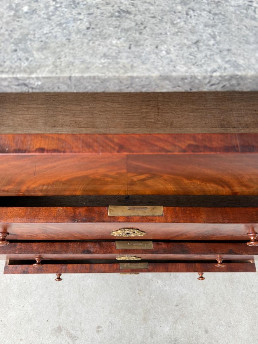 Franse empire commode, met fraai over alle laden doorlopend bloem mahonie, gris de Marais hardstenen blad (marmer).