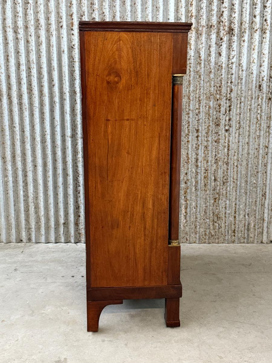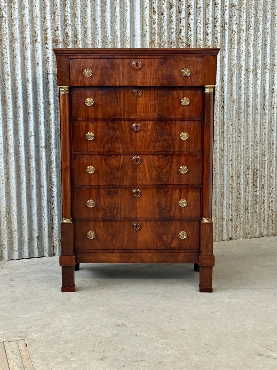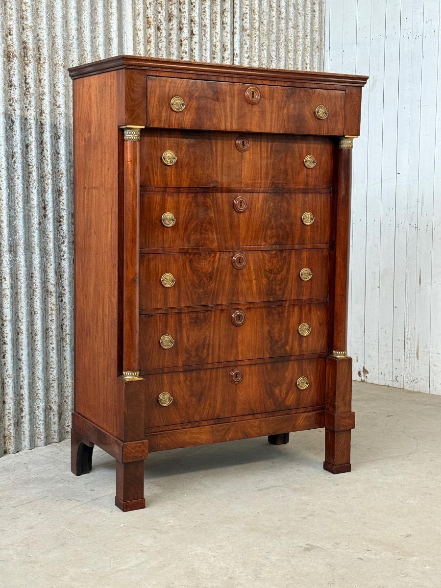 Hollands empire hoge ladekast of commode, met fraai over alle laden doorlopend mahonie fineer.