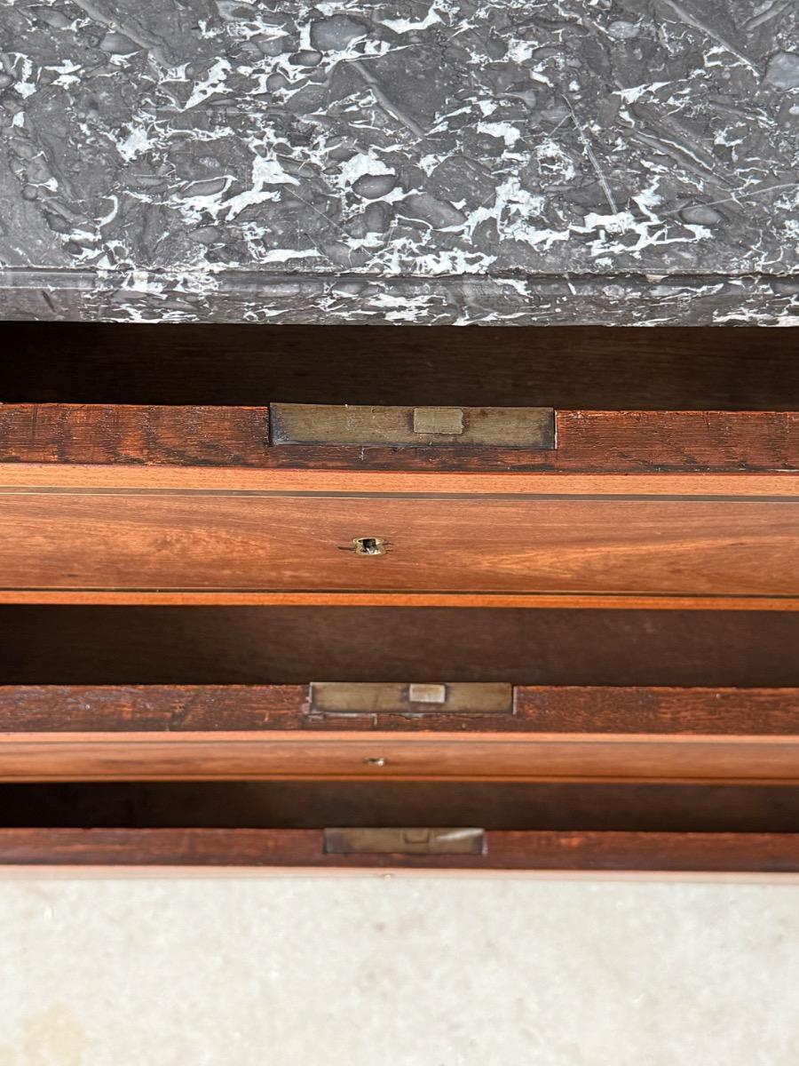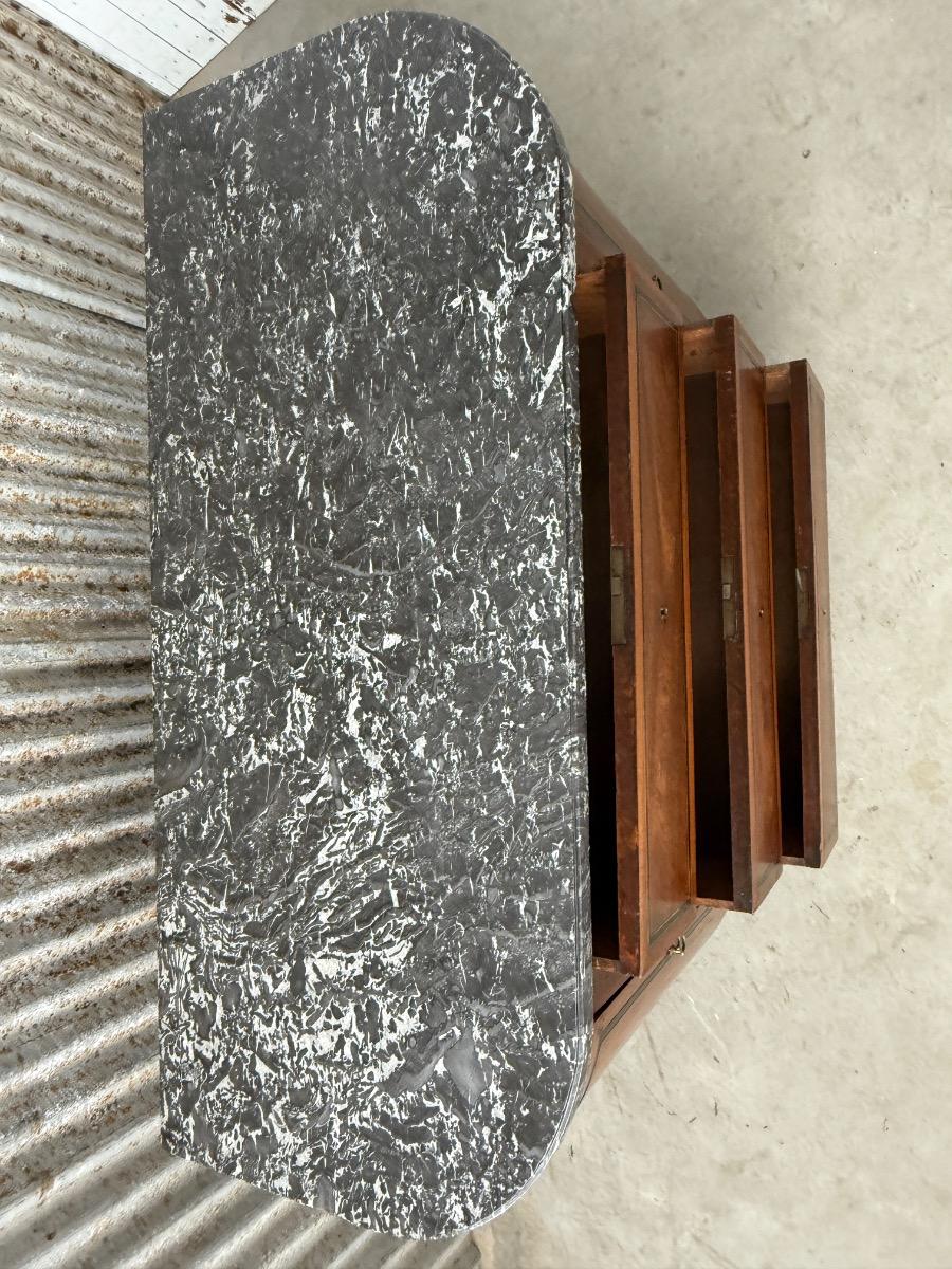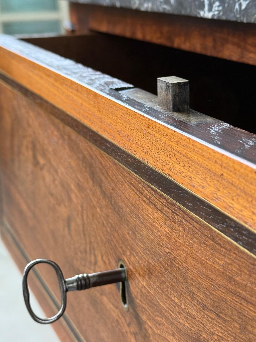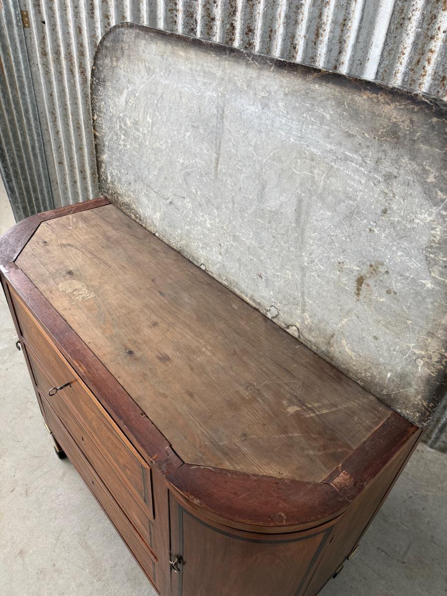 Onder het 3 cm (!!) dikke St. Anna marmer centraal 3 flinke laden met werkende oorspronkelijke sloten en sleutel. Aan weerskanten een kwart ronde deur met daarachter een legplankje.