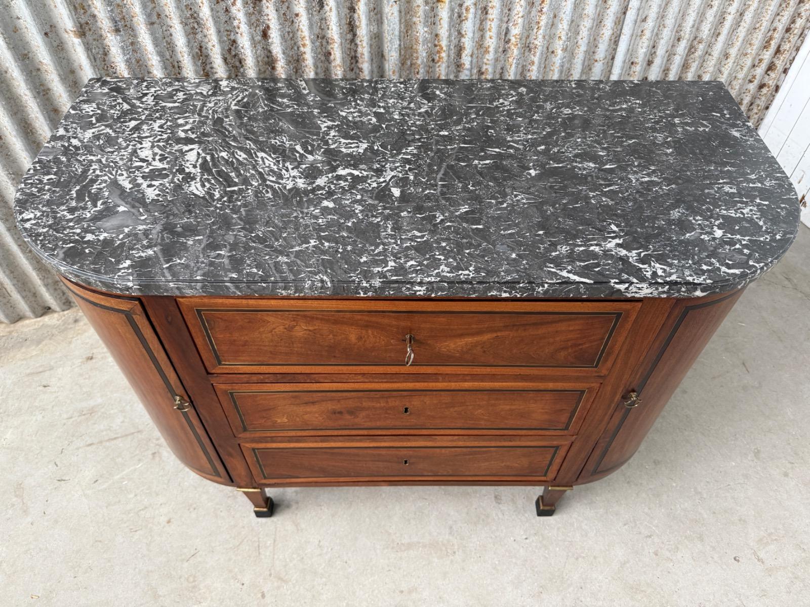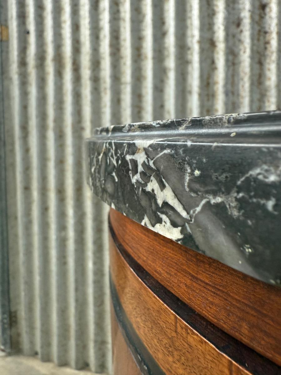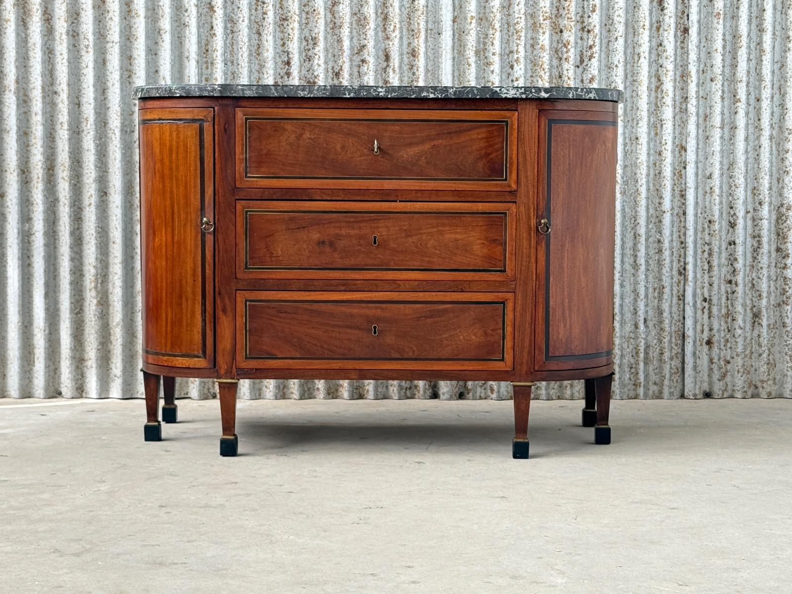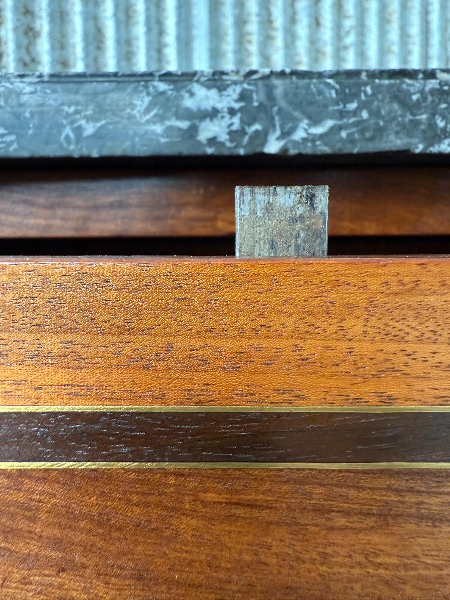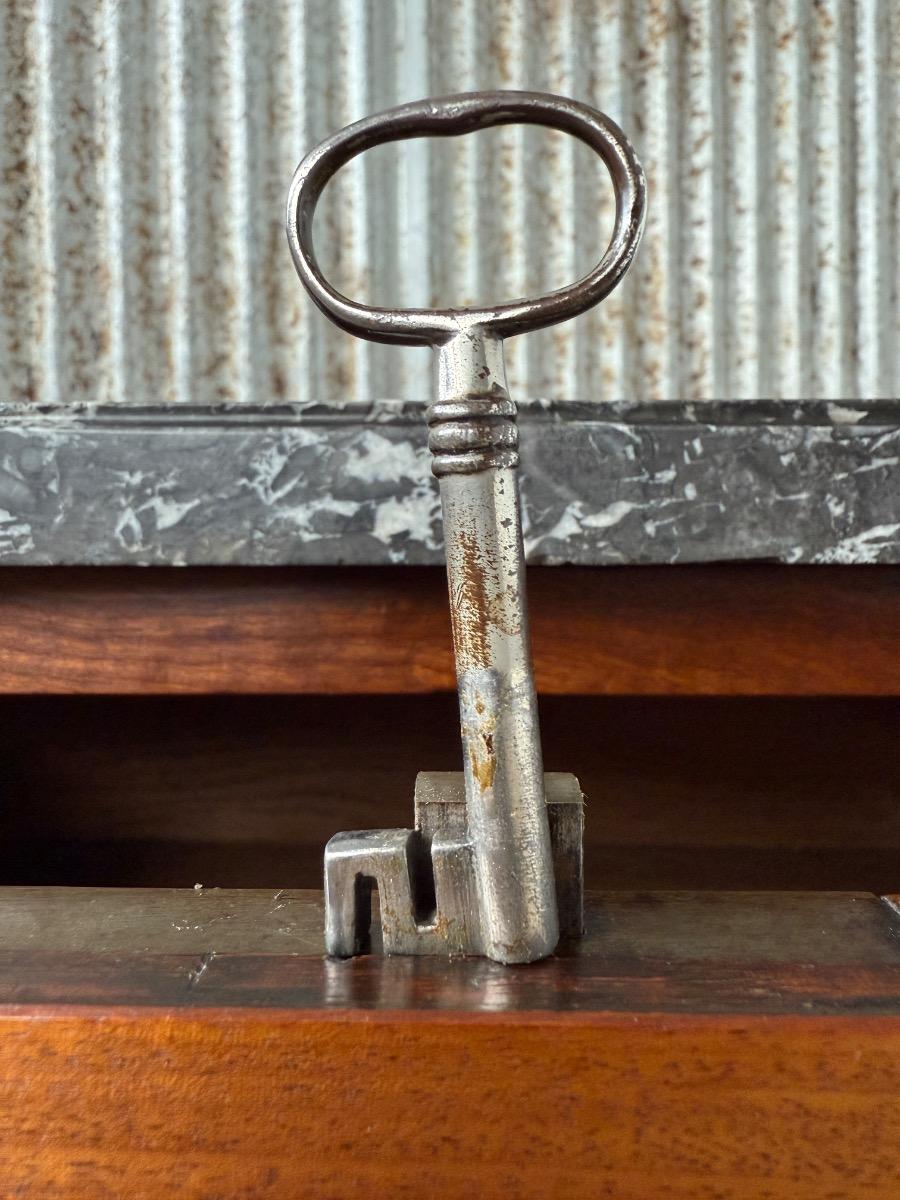 Onder het 3 cm (!!) dikke St. Anna marmer centraal 3 flinke laden met werkende oorspronkelijke sloten en sleutel. Aan weerskanten een kwart ronde deur met daarachter een legplankje.