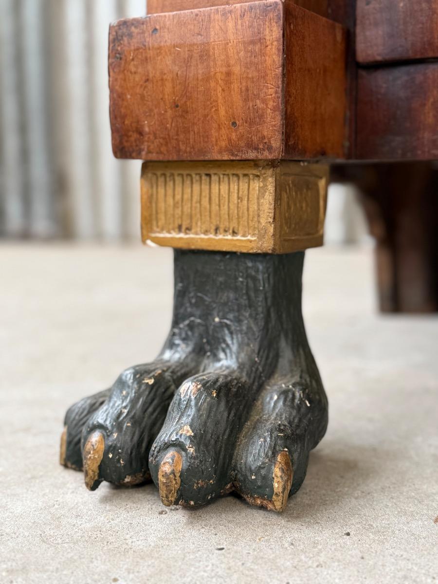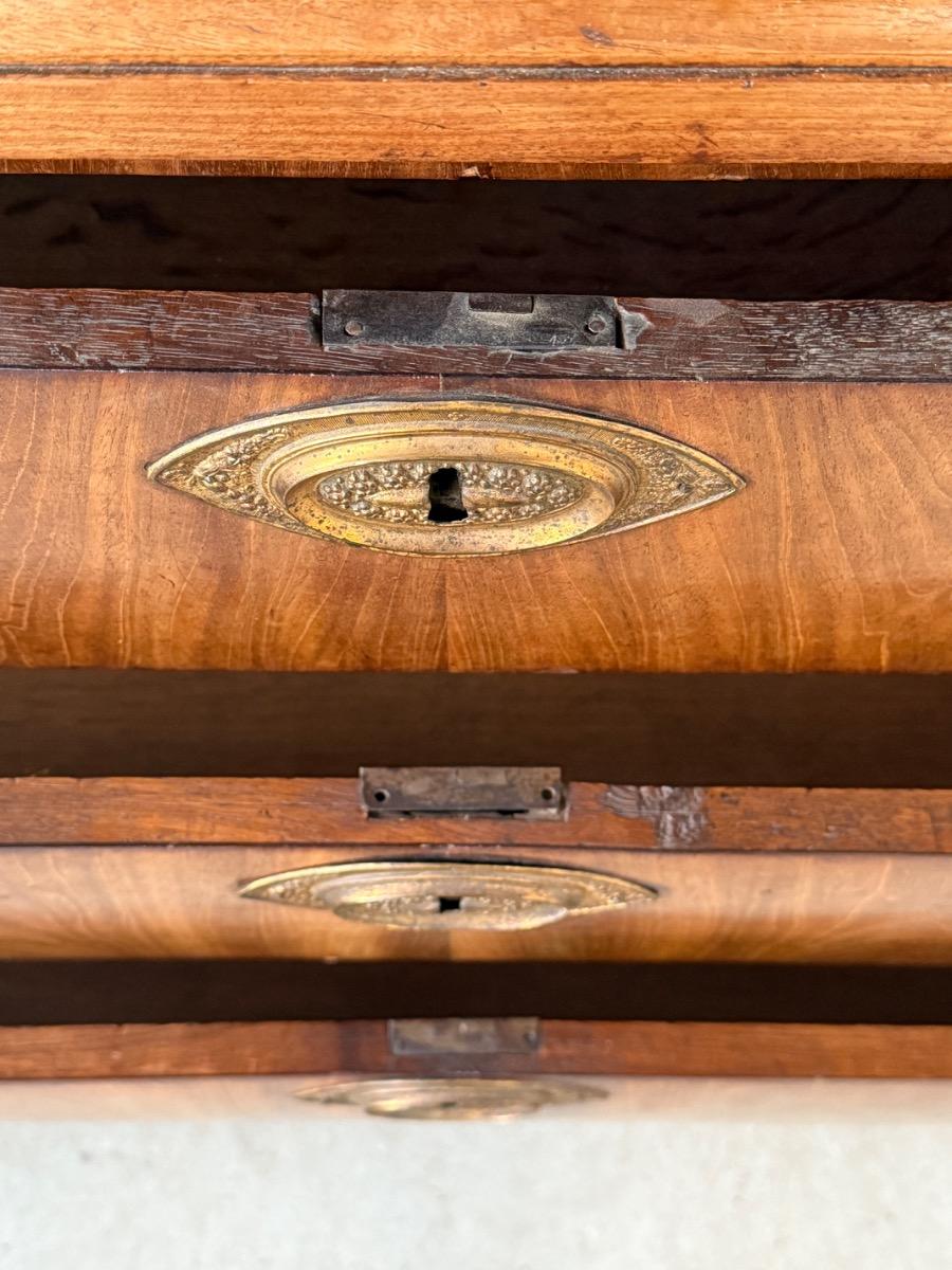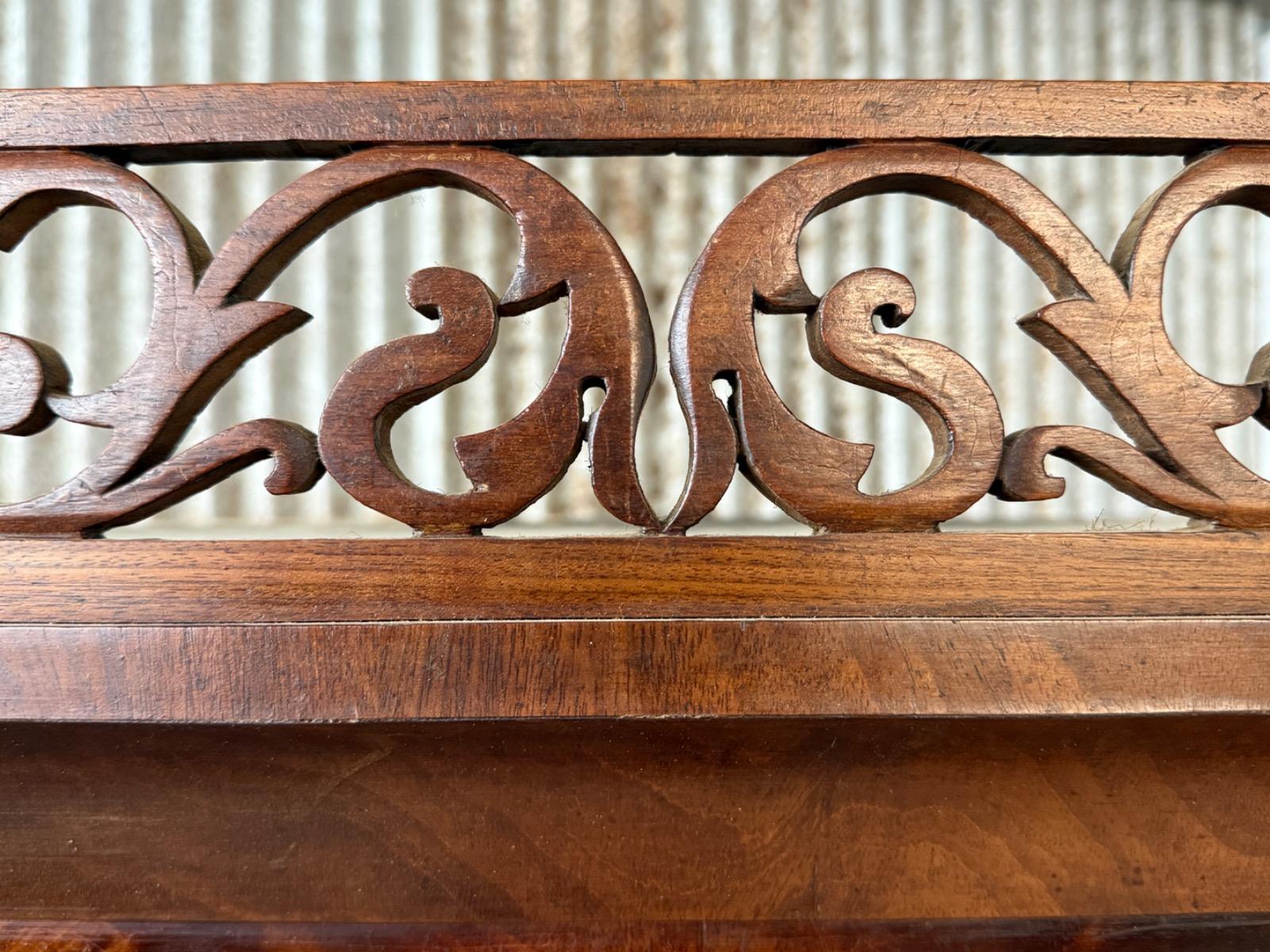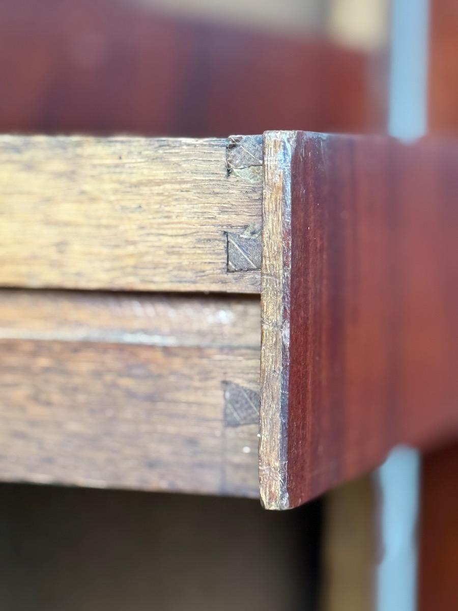 Bloem mahonie op eikenhout gefineerd, achterwand oorspronkelijk en compleet. Drie brede laden in de onderkast geflankeerd door twee volle vierkantige pilaren.