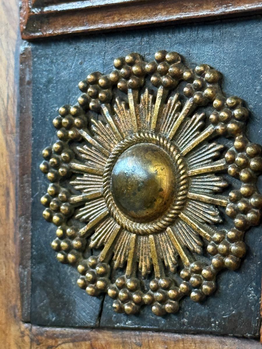 Deuren voorzien van volle pilaren en verguld beslag en rozetten.