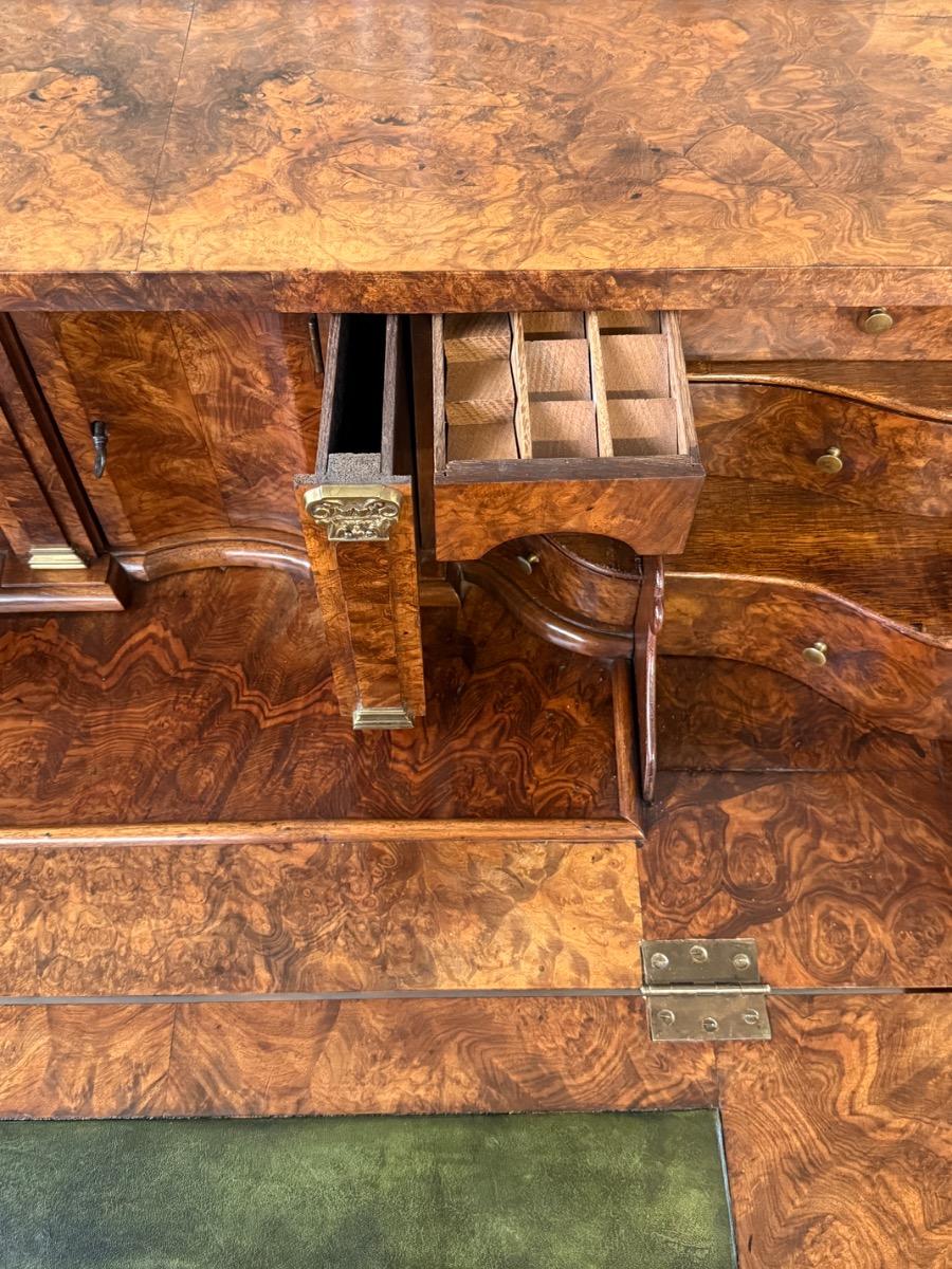 Interieur met deurtje, keldertje en laden in interieur. Klep ingelegd met olijf groen kalfsleder.