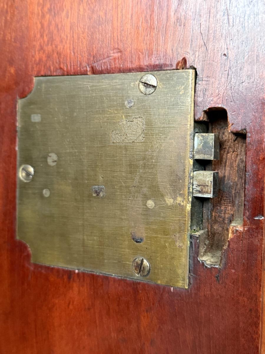 Bloem mahonie op eikenhout gefineerd, achterwand oorspronkelijk en compleet. Drie brede laden in de onderkast geflankeerd door twee volle vierkantige pilaren.
