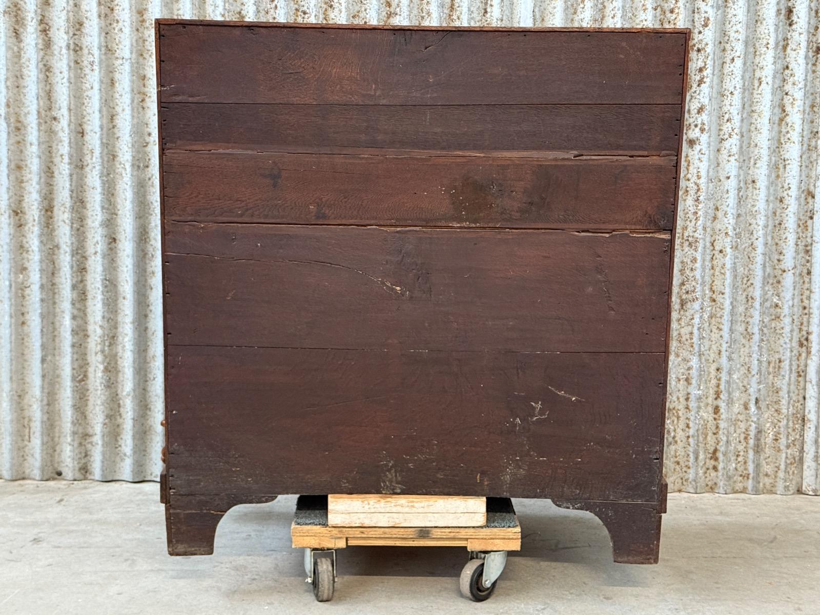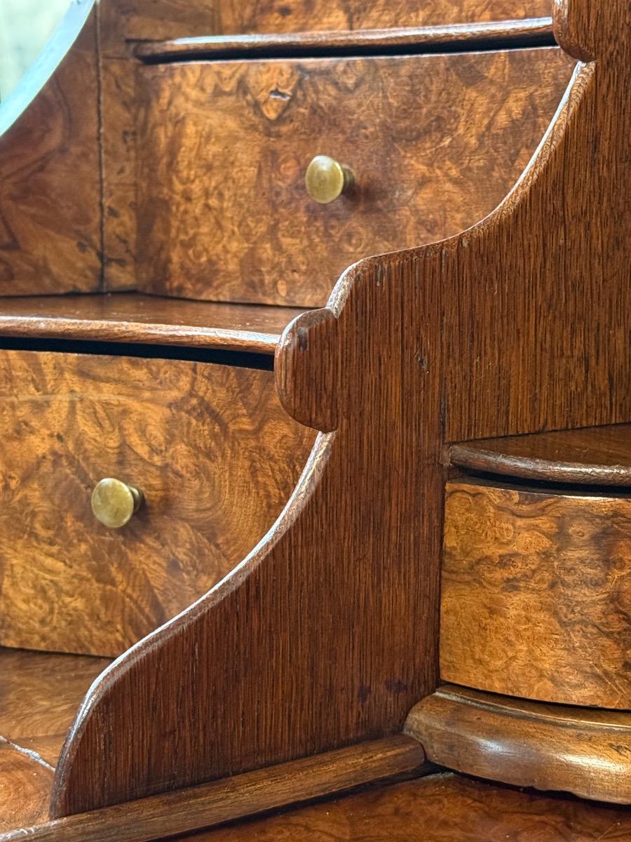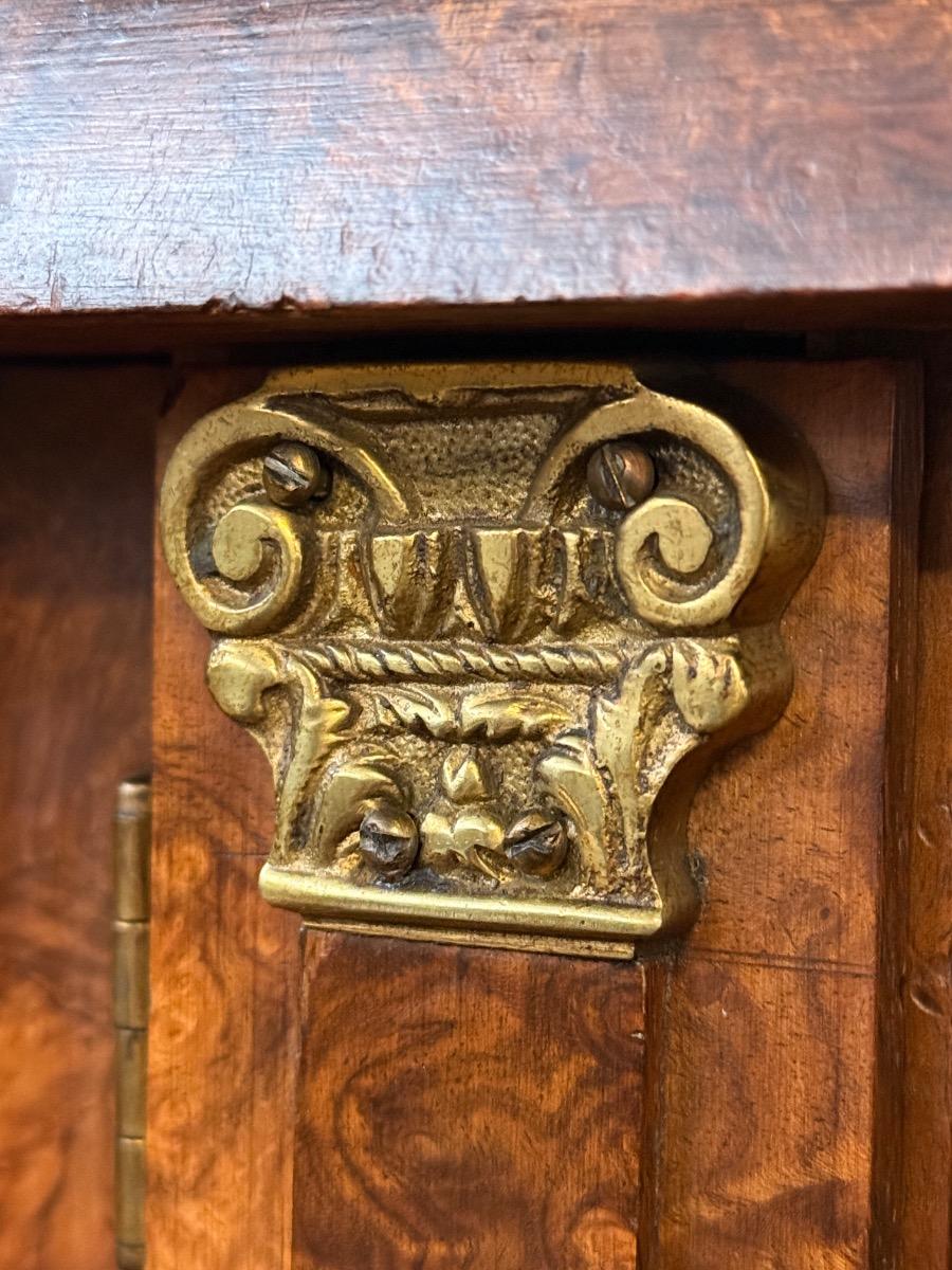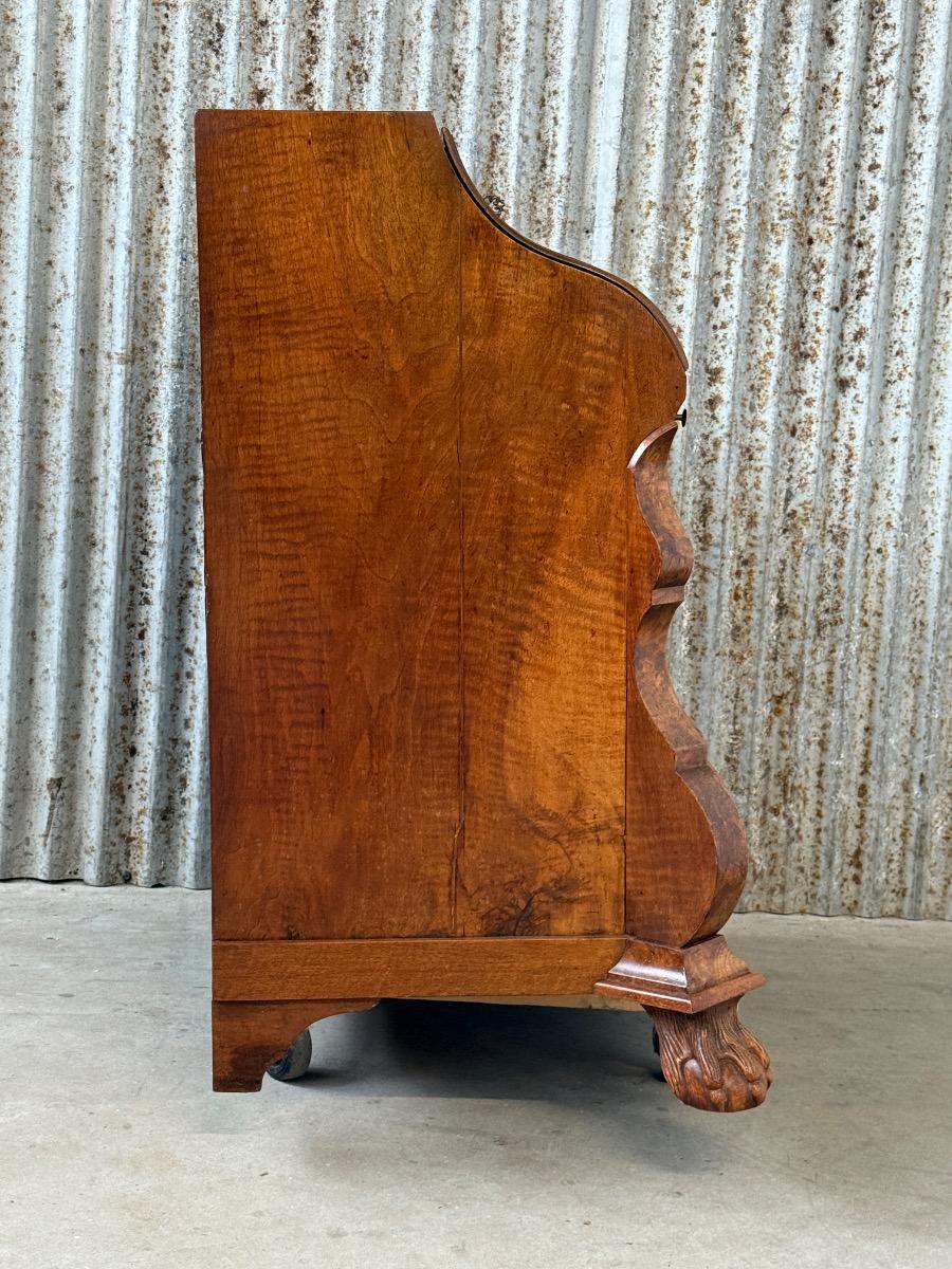 Smal of klein Hollands wortelnoten klepbureau, midden 18e eeuw. Met ‘S’ vorm klep, gegoten messing beslag, knopjes en scharnieren. Op "bol-klauw poten".