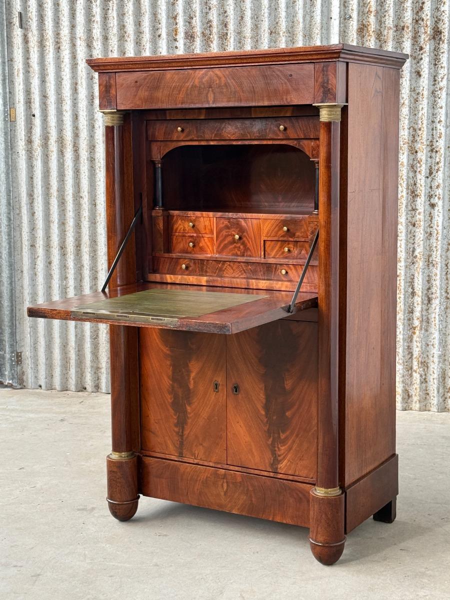 Zeer smalle empire klep secretaire, volle mahonie pilaar met vuur vergulde messing kapitelen.